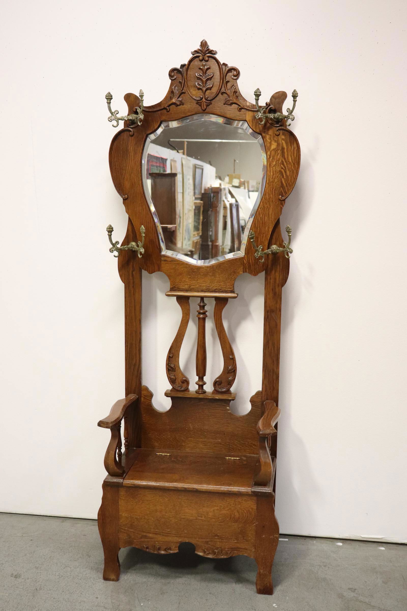 Sold Antique Hall Tree Stand Mirrored Seat Bench Vintage Wooden