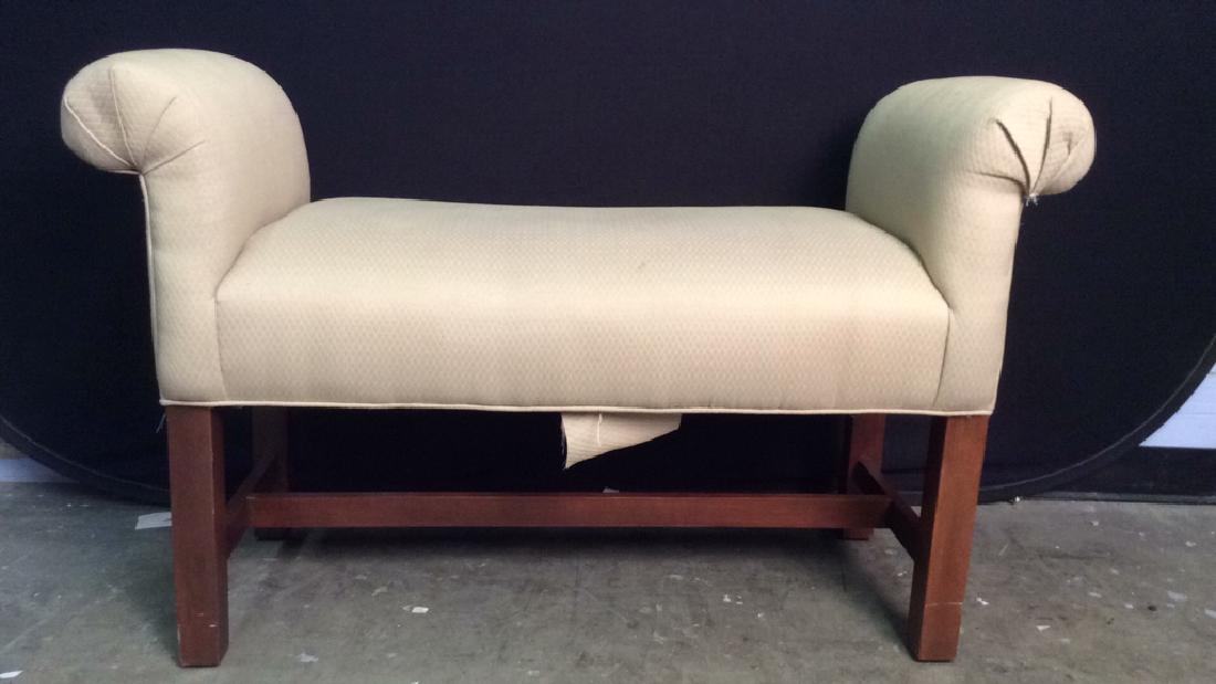 This versatile bench features roll over arms and an attached welted seat.