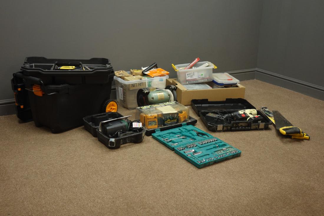 A Bosch Hand Saw Parkside Bench Grinder Socket Set And A Bench Vice