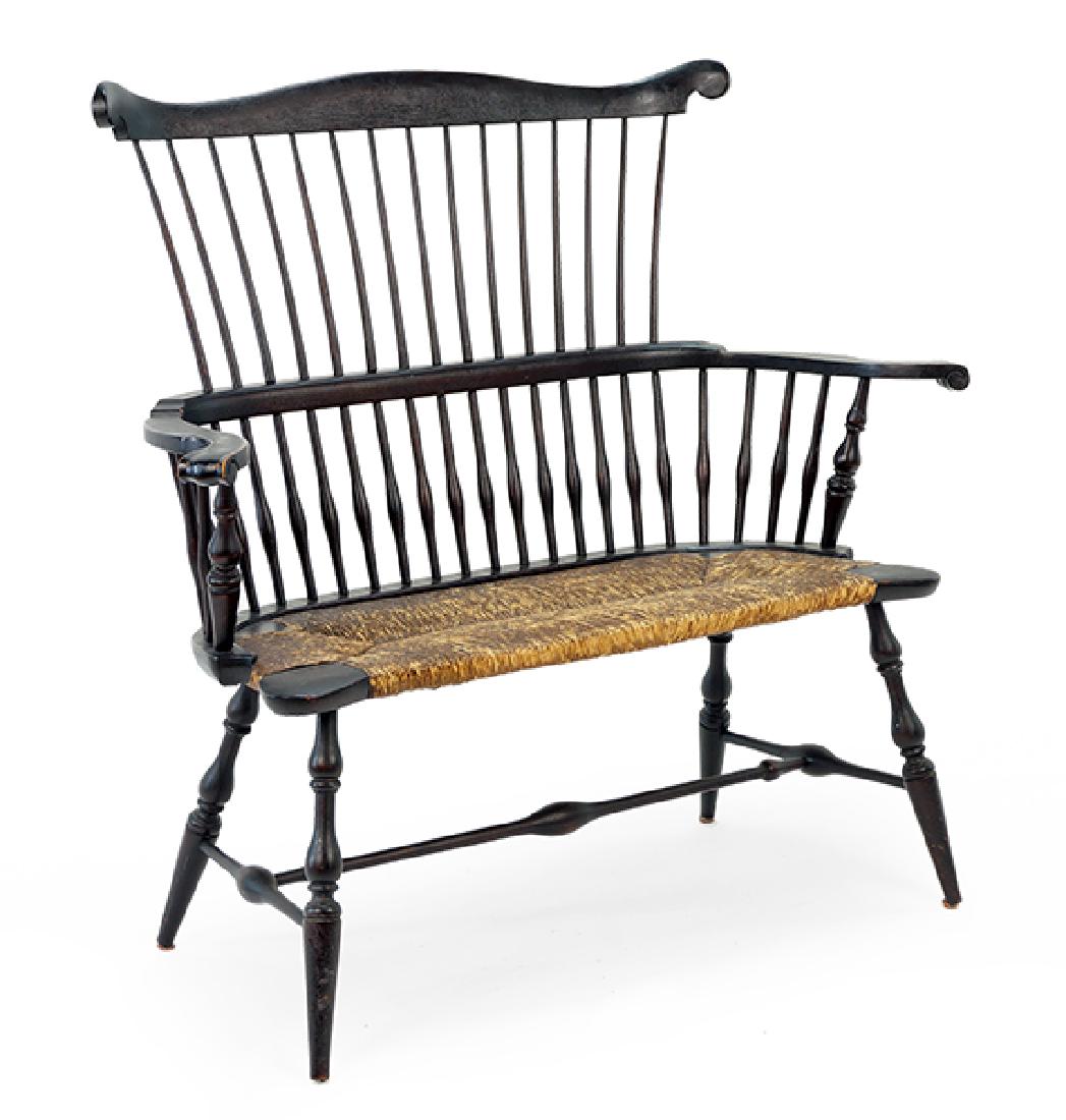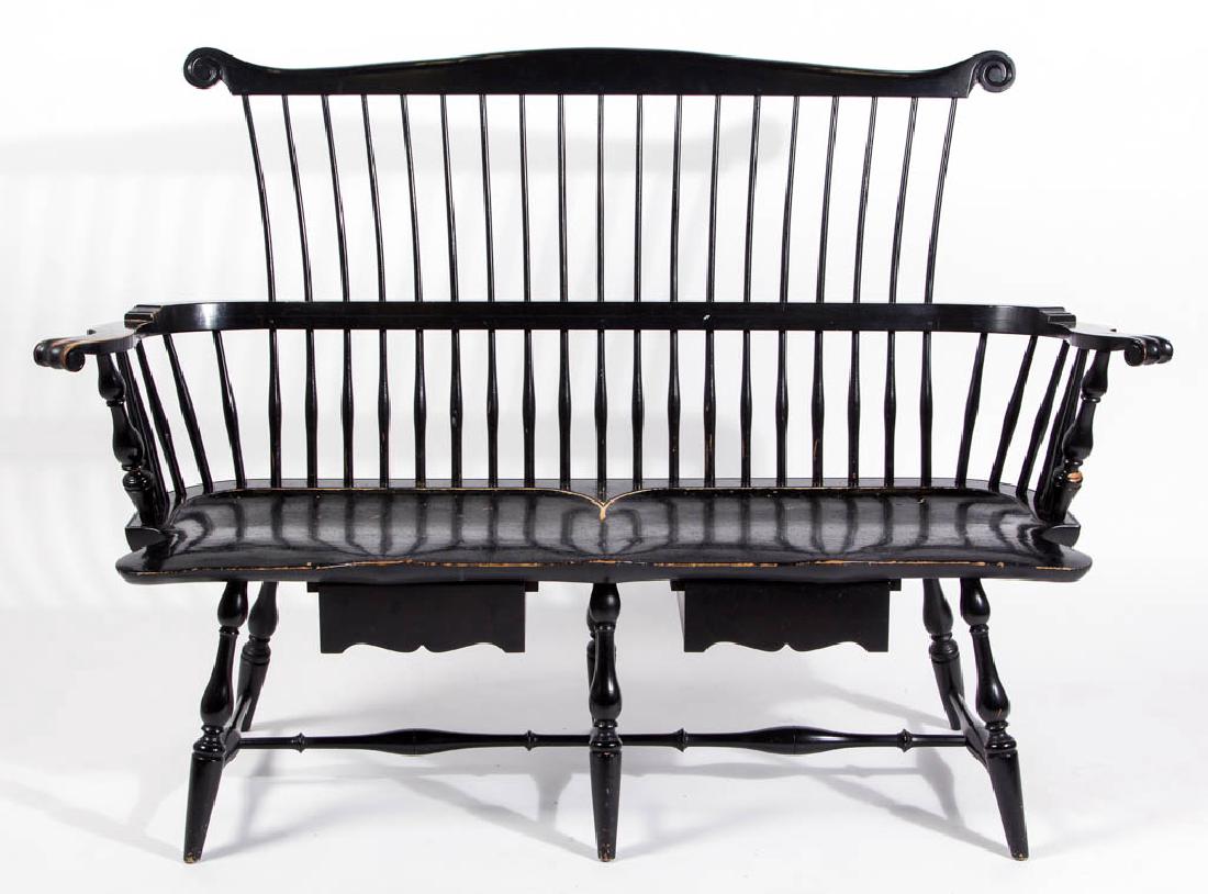 A Windsor Style Black Painted Bow Back Settee American 20th